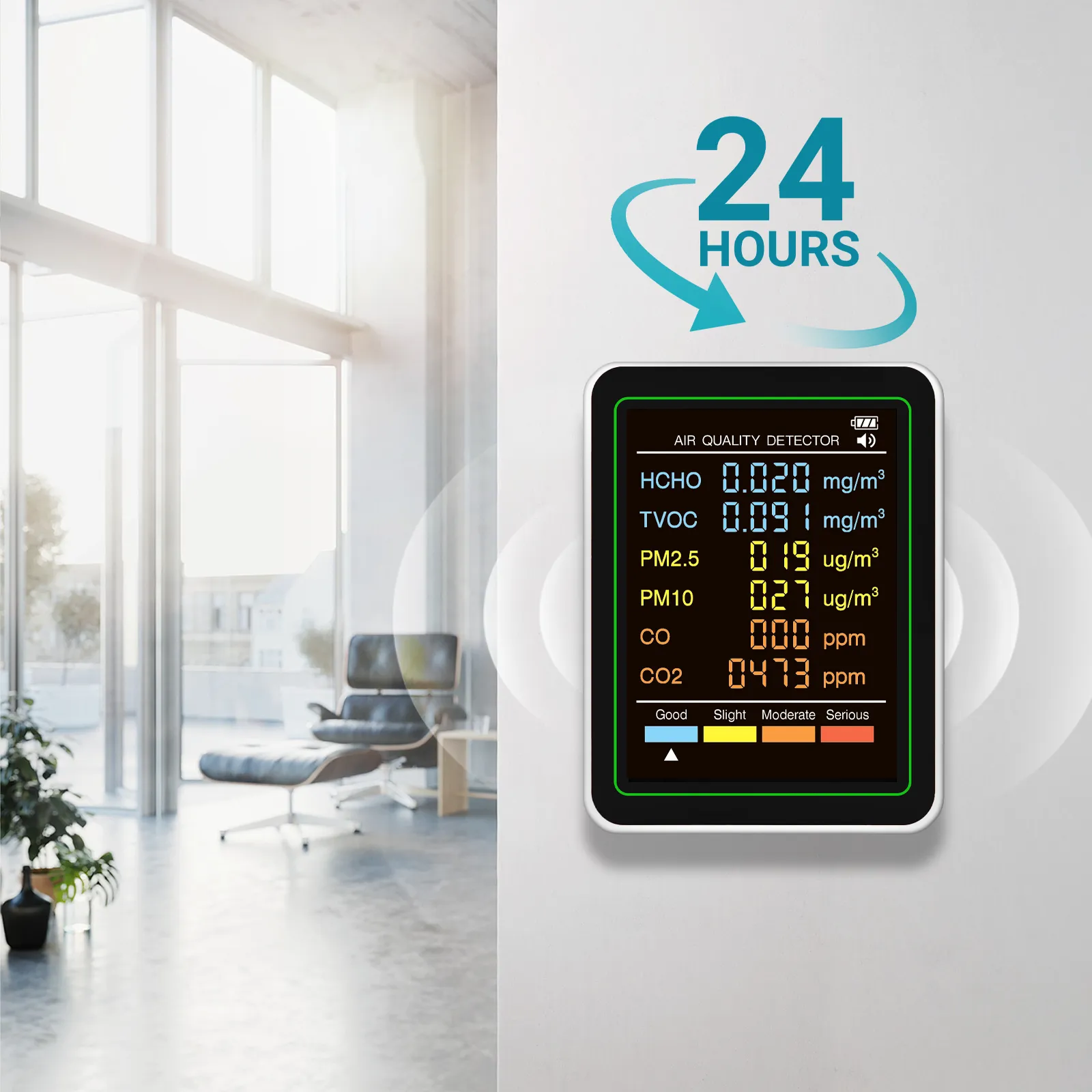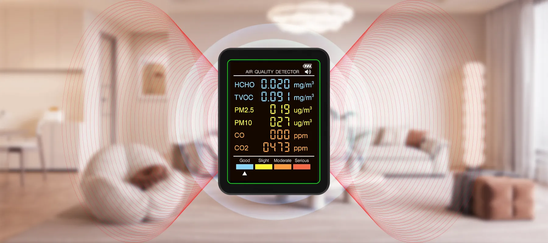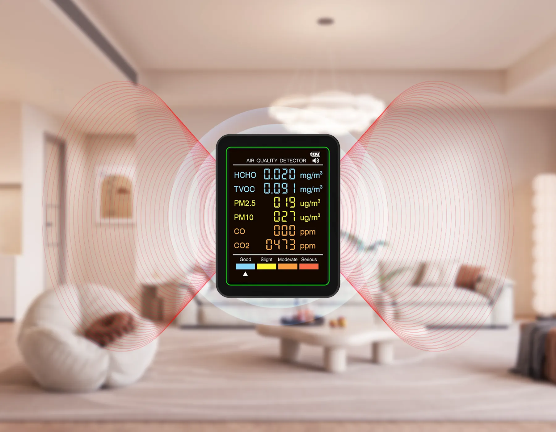 - Comprehensive Detection: Detects formaldehyde, PM2.5, CO, CO2, and more.